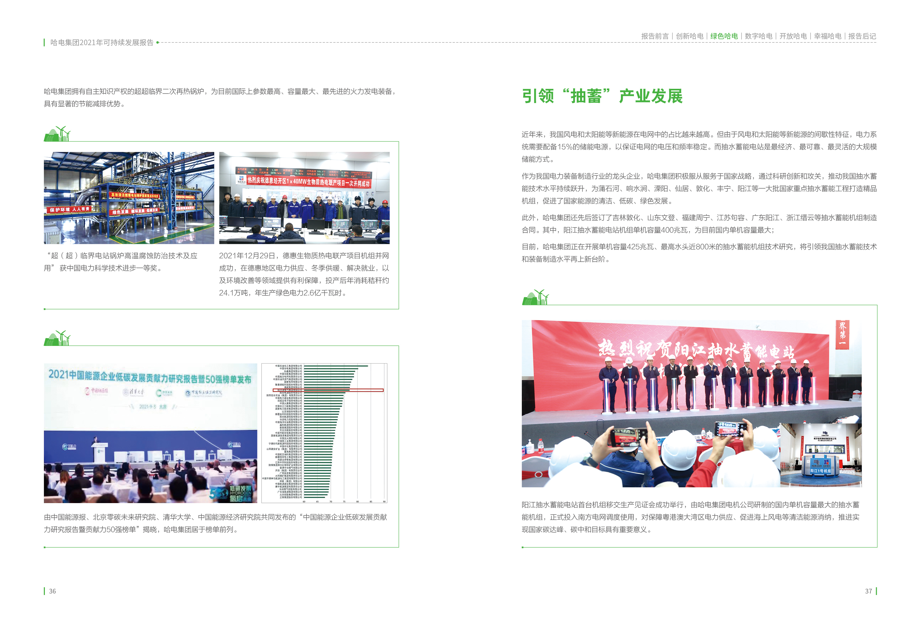 《哈電集團(tuán)2021年度可持續(xù)發(fā)展報告》以“創(chuàng)新哈電”、“綠色哈電”、“數(shù)字哈電”、“開放哈電”、“幸福哈電”為主體內(nèi)容,全面展現(xiàn)哈電集團(tuán)2021年在改革發(fā)展、客戶責(zé)任、貢獻(xiàn)社會、保護(hù)環(huán)境、愛護(hù)員工等方面取得的成績。通過“以高質(zhì)量黨建引領(lǐng)高質(zhì)量發(fā)展”、“70載書寫光榮與夢想”、“白鶴亮翅盡展大國重器——為全面踐行‘雙碳’戰(zhàn)略目標(biāo)貢獻(xiàn)哈電力量”、“履行政治責(zé)任、助力鄉(xiāng)村振興”、“沉淀企業(yè)文化、凝練哈電精神”五個責(zé)任專題,聚焦哈電集團(tuán)在黨建引領(lǐng)、70年發(fā)展歷程、打造精品工程、助力鄉(xiāng)村振興、沉淀企業(yè)文化等領(lǐng)域的重點工作成效,彰顯了中央企業(yè)的責(zé)任擔(dān)當(dāng)。