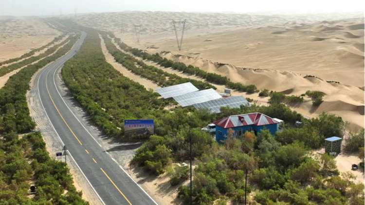 圖為我國首條零碳沙漠公路——塔里木沙漠公路