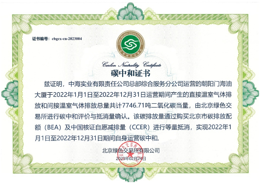 北京綠色交易所按照制定碳中和計劃、實施減排行動、碳排放核算、北京碳配額及CCER等量抵消,“碳中和”評價和聲明等全流程要求,支持中國海油總部大樓實現年度自身運營“碳中和”目標,并頒發“碳中和”證書。