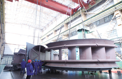 日前,哈電集團哈爾濱電機廠有限責任公司車間里一派忙碌的生產場景,工人們全身心地投入到白鶴灘、豐寧、兩河口等國家重大水電項目產品生產中。圖為該公司職工在生產世界單機容量最大白鶴灘水電機組1/2瓣座環組合。